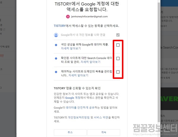 티스토리 플러그인데 대해서 구글 꼐정에 대한 액세스 요청을 동의해야만 진행이 가능합니다. 세 항목 모두 체크하고 계속을 클릭하여 진행합니다.