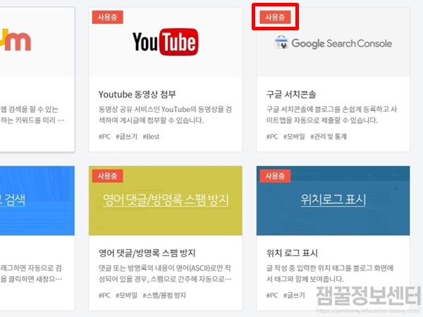 적용이 완료되면 구글 서치콘솔 플러그인에 사용중이라는 문구가 표시됩니다. 혹시 나중에 해지하고 싶을 때는 해지버튼만 누르면 됩니다.