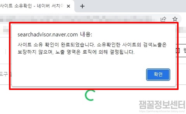 티스토리 블로그에 제대로 메타태그가 등록되었다면 사이트 소유 확인 팝업 메시지가 뜨면서 소유권을 확인 할 수 있습니다.