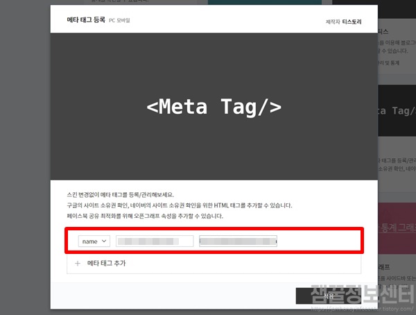 메타 태그 등록 플러그인 팝업창이 뜨면 메타 태그 추가를 클릭하고 빈칸에는 좀 전에 네이버 서치어드바이저 사이트에서 확인할 수 있는 메타태그의 내용을 복사 붙여넣기 합니다. 맨 앞은 name으로 두고 메타태그의 따옴표 안의 내용만 가각 넣어주면 됩니다. 작성 완료 후 적용을 클릭합니다.