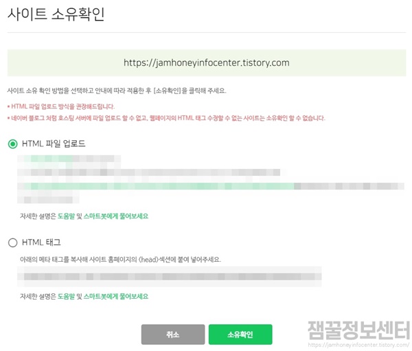 다시 네이버 서치어드바이저로 와서 html태그에 체크하고 소유확인을 클릭합니다. 티스토리 블로그에 소유권 검증용 메타 태그를 등록해 놓은 상태에서 진행하는 겁니다.