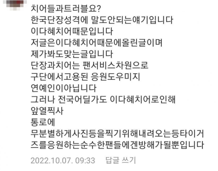 전4년 동안 경기장 안에서 제가 주목받으려고 생각한 적은 단 한 번도 없었으며,누구보다 더 열심히 응원하고 개인 연습했었습니다.그리고 단장님께서 저를 저격한 글이 아니었다고 따로 말씀해 주셨고,금방 잠잠해질 줄 알았습니다.그런데 혼자만 대형이 어긋나고 공연 실수를 한다는 둥 안 좋은 쪽으로 이야기가 와전되고 있는 지금,전 실수하지도 않았고 열심히 하지 않은 적도 없기에 이대로 가만히 있으면 인정하는 꼴이 되니 해명하는 게 맞다고 생각해 이 글을 올립니다.