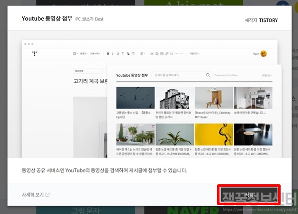 유튜브 동영상 첨부 팝업창이 뜨면 우측 하단의 적용 버튼을 클릭하면 완료입니다. 유튜브 동영상을 검색하여 적용할 수 있는 기능입니다. 따로 유튜브에 접속하지 않더라도 플러그인 내에서 첨부하고 싶은 주제의 영상을 검색하여 첨부할 수 있습니다.