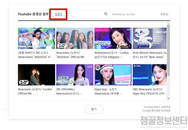 플러그인을 클릭하면 팝업창이 뜨고 검색어를 입력하면 관련 동영상 목록이 나옵니다. 원하는 동영상을 클릭하면 에디터 화면으로 동영상이 첨부됩니다.