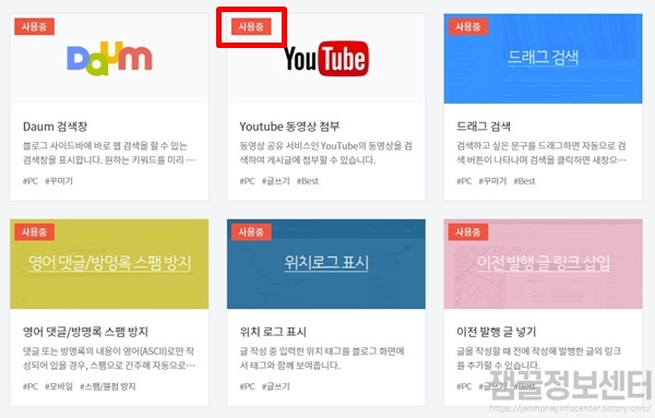 플러그인 적용이 되었다면 플러그인 좌측상단에 사용중이라는 문구가 뜨게 됩니다. 만약 플러그인 기능을 해제하고 싶다면 다시 클릭하여 적용해제를 하면 됩니다.