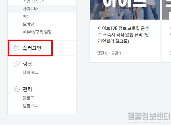 티스토리 관리자 페이지에 들어가서 우측 메뉴 중 플러그인을 클릭합니다. 플러그인 관련된 모든 설정을 할 수 있는 메뉴입니다.